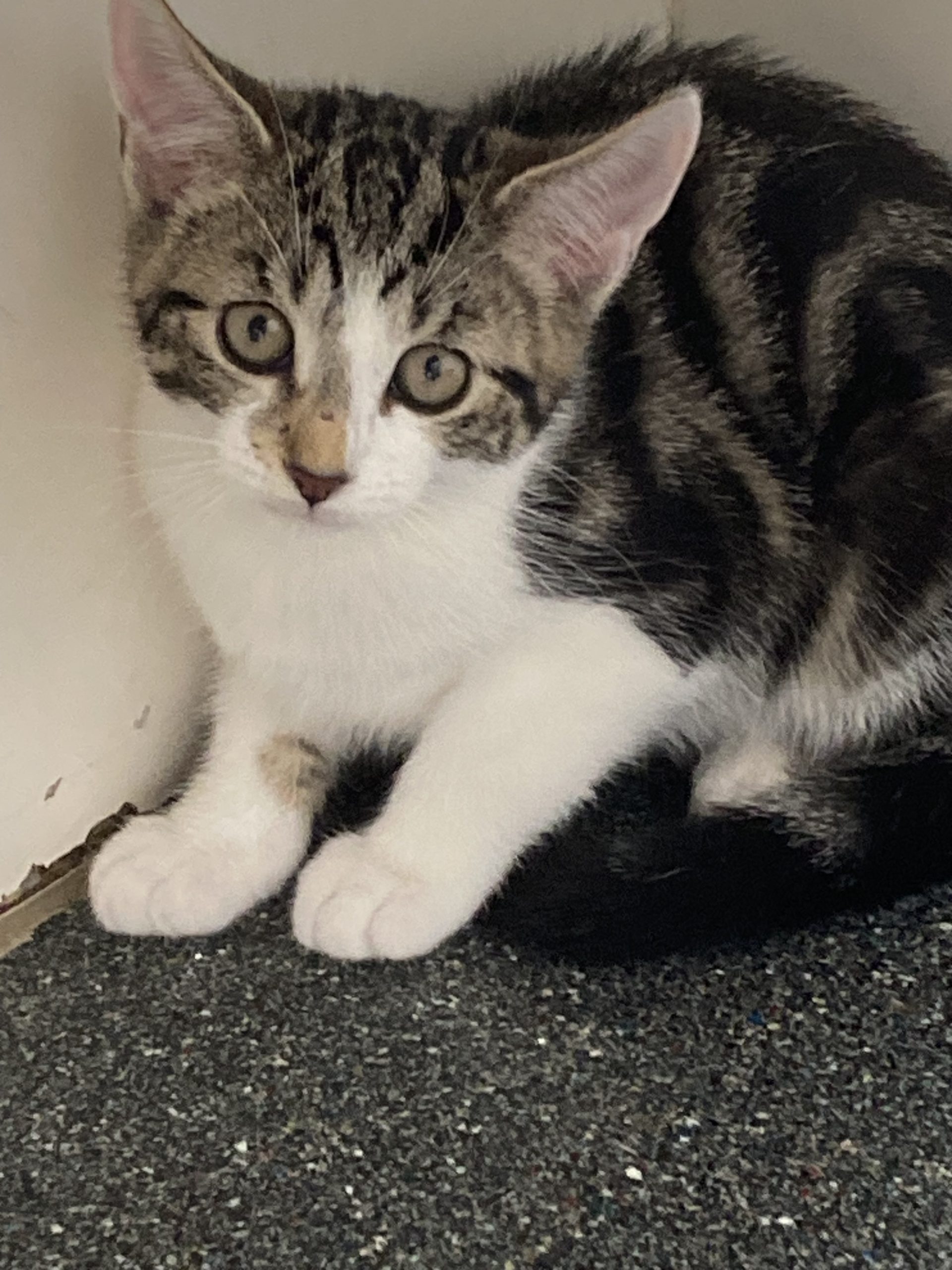 Daphne, who is a little spitfire, was born in the home of an 85 year old lady, to a cat she took on as a stray, not realising the cat was pregnant. Despite being born in a home, the kittens were clearly not handled very much and are fearful of being stroked and held by humans. They are getting used to their foster mum and she can now stroke them and pick them up but they do hiss and sometimes shake, so are not yet fully comfortable with being handled. A new owner will need to be an experienced cat owner who is committed to socailising Daphne further ( we usually find this happens more quickly once the kitten is separated from its litter mates but we do not have the foster home capacity to do this at the moment.)