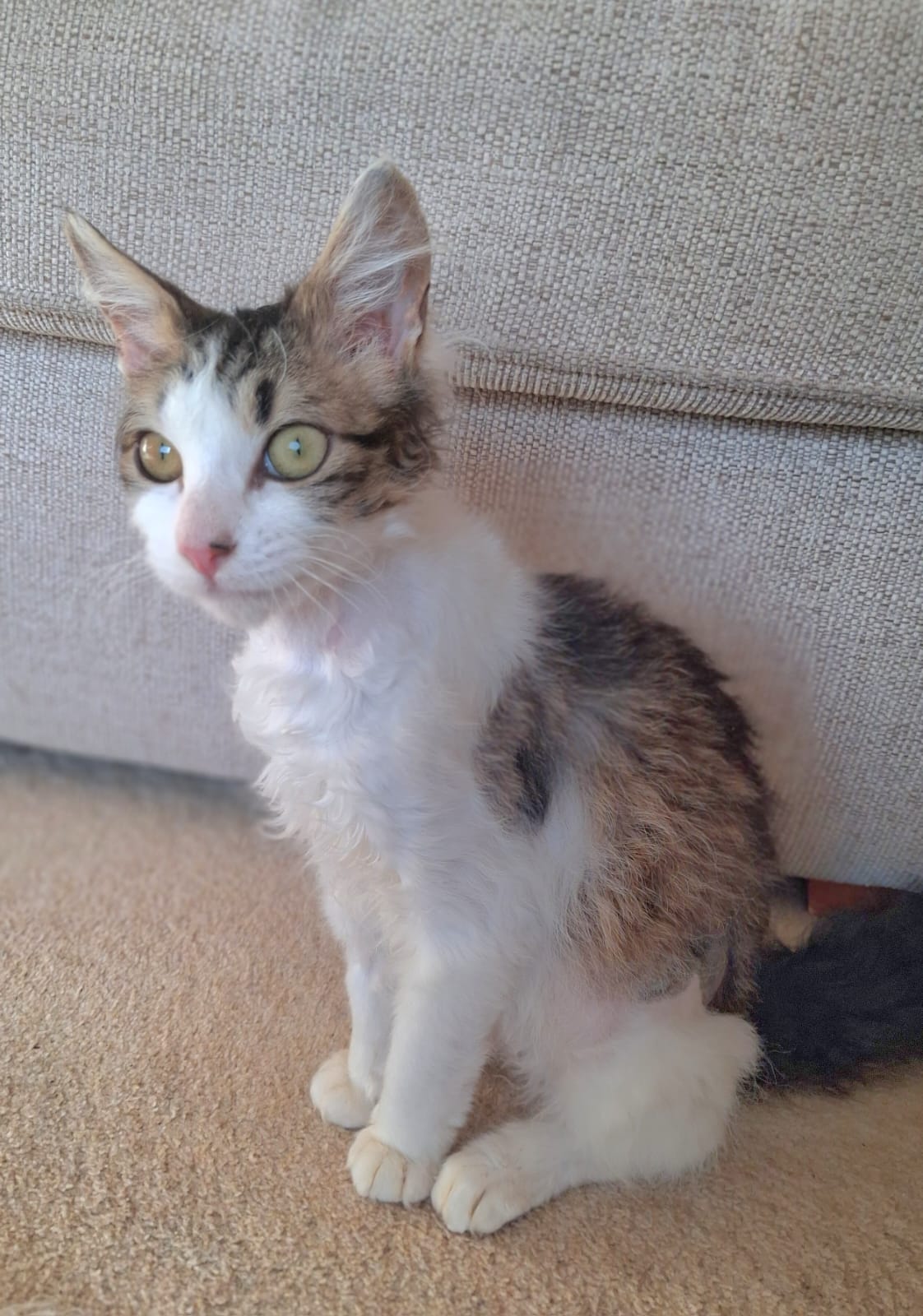 Melon is a Rex x who was found as a stray and handed into a local vet. She is full of beans and joy, and loves a lap once she has galloped around palying, at a hundred miles an hour! She loves to sleep tucked into her foster mum's neck! She is a mischievous, [...read more]
